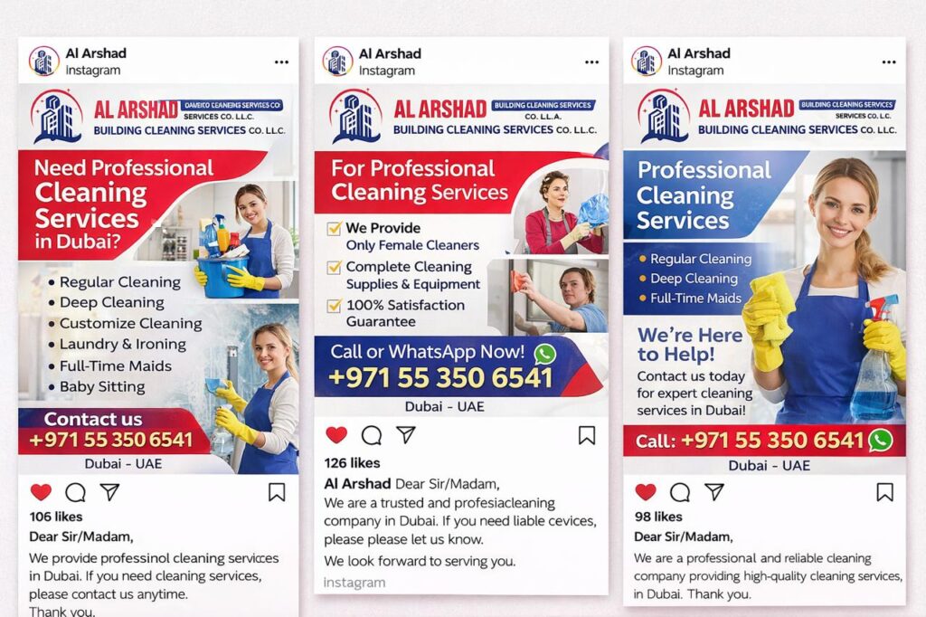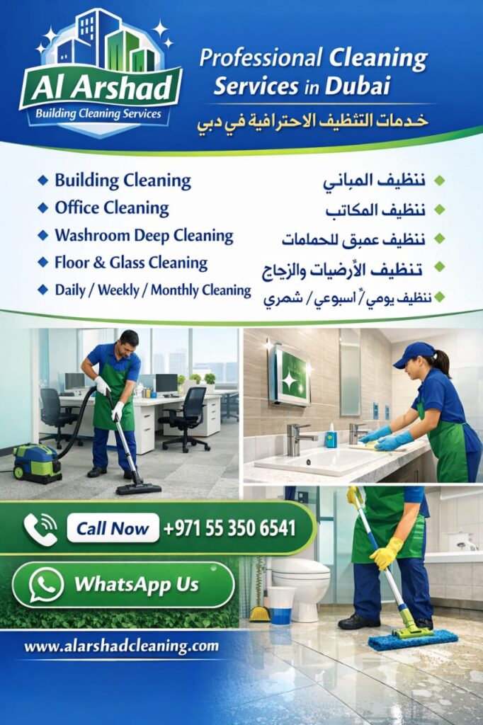 في Al Arshad Cleaning، نقدم خدمات تنظيف احترافية في دبي للمنازل والمكاتب والمساحات التجارية. يضمن فريقنا الخبير نظافة مثالية، بيئة صحية ومنعشة، مع استخدام معدات ومواد تنظيف متكاملة لتحقيق أفضل النتائج لجميع عملائنا.